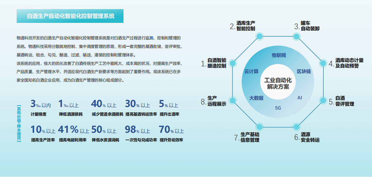 物通科技借助自身優(yōu)勢(shì),借助與企業(yè)、高校多年深度合作過程中積累的豐富管理經(jīng)驗(yàn),在傳承白酒傳統(tǒng)生產(chǎn)工藝的基礎(chǔ)上,攻克了白酒生產(chǎn)過程及基酒質(zhì)量控制方面的技術(shù)難題,成功研發(fā)了白酒生產(chǎn)自動(dòng)控制及信息管理系統(tǒng),改變了傳統(tǒng)酒類庫房操作和管理模式,實(shí)現(xiàn)了用電子信息技術(shù)提升傳統(tǒng)白酒行業(yè)酒源管理和質(zhì)量的目的,推進(jìn)了釀酒科技成果產(chǎn)業(yè)化程,對(duì)打造名酒品牌作出新貢獻(xiàn)。