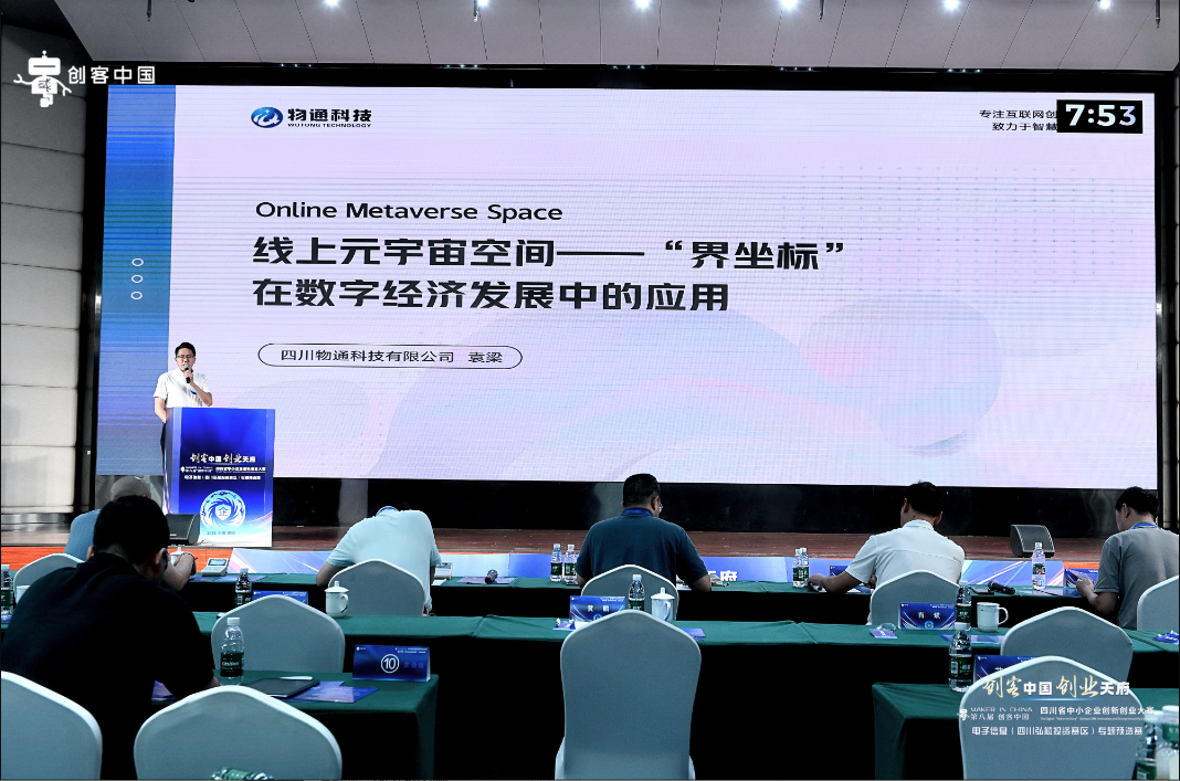 總經理袁梁先生作為物通科技的參賽代表參與了企業組的路演。他在演講中重點介紹了物通科技基于虛幻引擎、云渲染、AI以及區塊鏈等前沿技術,自主打造的線上元宇宙平臺——“界坐標”在數字經濟發展中的應用思路與成果。