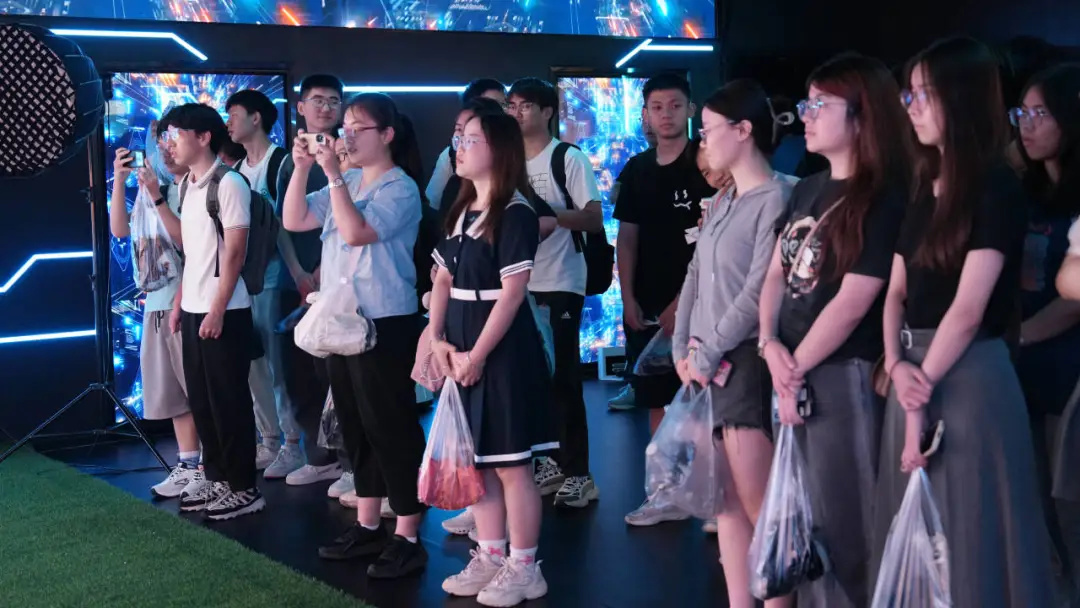 上午,近百名師生先參觀了物通科技打造的近1000平米的界坐標(biāo)·元宇宙數(shù)智實(shí)驗(yàn)工場,深入感受了實(shí)驗(yàn)工場作為新質(zhì)生產(chǎn)力的孵化基地,如何推動(dòng)酒類生產(chǎn)、倉儲(chǔ)管理、智慧文旅等實(shí)體產(chǎn)業(yè)向智能化、數(shù)字化轉(zhuǎn)型升級,釋放科技與產(chǎn)業(yè)融合的無限潛能。